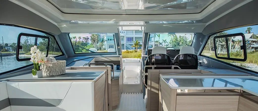 A power catamaran that delivers 40-knot speed, 2-foot-10-inch draft, and two full cabins without requiring a crew. Single-level layout flows from helm to cockpit with zero compromises on comfort or capability.
