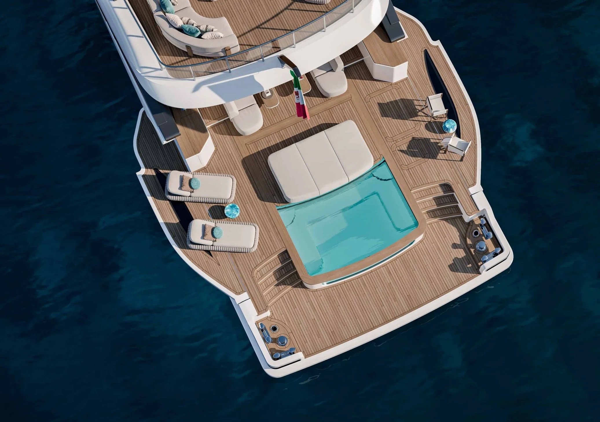 139 feet of Italian engineering built around a 70-foot outdoor deck and an 8.3-square-meter pool. This is not a yacht with a beach club. This is a beach club that floats.