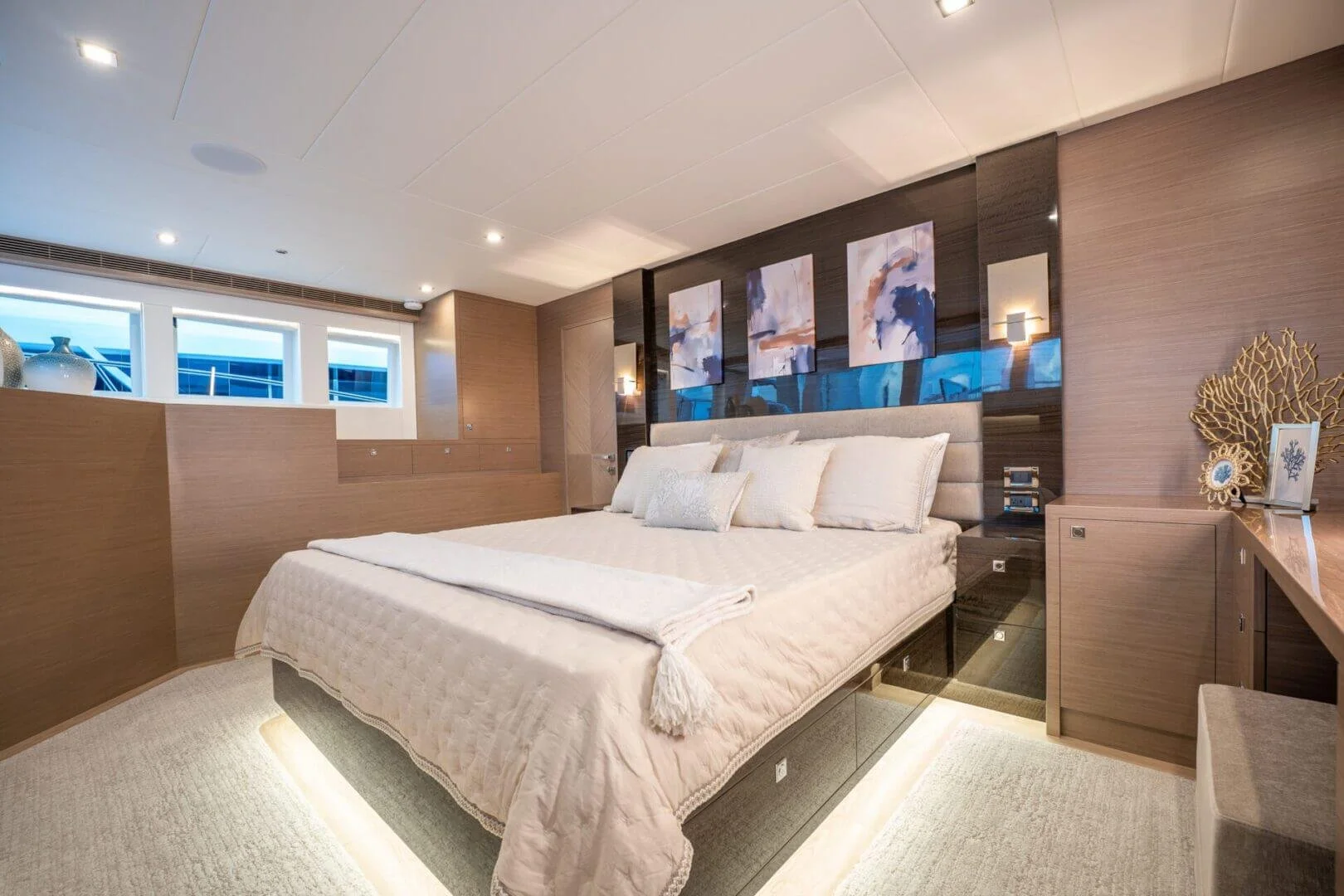 The PC68 uses SCRIMP construction and Humphree active stabilization, which are the right choices for a long-range catamaran. The 24-foot-6-inch beam creates genuine volume without the weight penalty of a monohull, and the 5-foot-4-inch draft keeps you in cruising grounds that larger boats can’t access. The twin MAN i6-850s are proven, serviceable engines, and the fuel capacity supports the range claims. The build quality reflects Horizon’s decision to limit production and maintain control over the process.