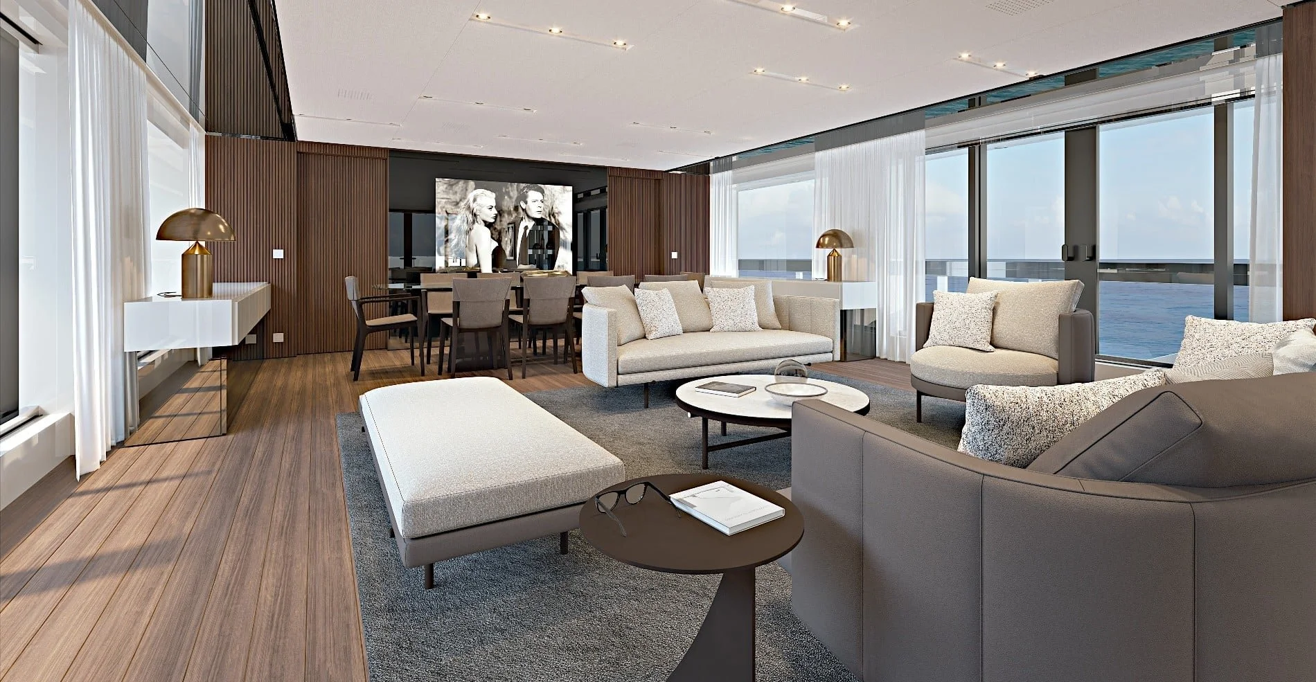 | Cabins / Heads | 5 guest cabins (typically 10–11 guests, including a three-level owner's apartment of ~145 sqm) plus generous crew quarters; all guest cabins en-suite. | |