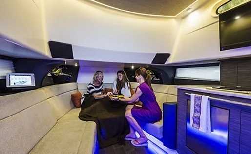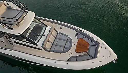 The Minted Analysis: With the quad-engine setup, you’re getting serious redundancy and massive low-end torque. The bow lounge is, in my opinion, the best-engineered social space on any production boat under 50 feet.